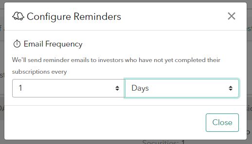 Through DealMaker, an issuer can update the frequency at which email reminders are sent out to investors to complete their agreement. When you are logged in as an Issuer, you can select the deal you are an issuer in. Then, it should take you to the Investor tab of your deal. Then, you can click on the 'Configure Email Reminders' button to bring out the configuration window.